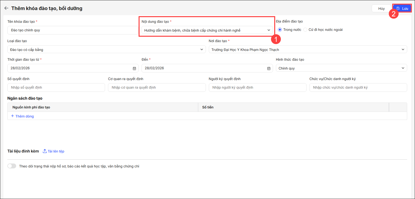 2. Khai báo các thông tin về khóa đào tạo, bồi dưỡng: