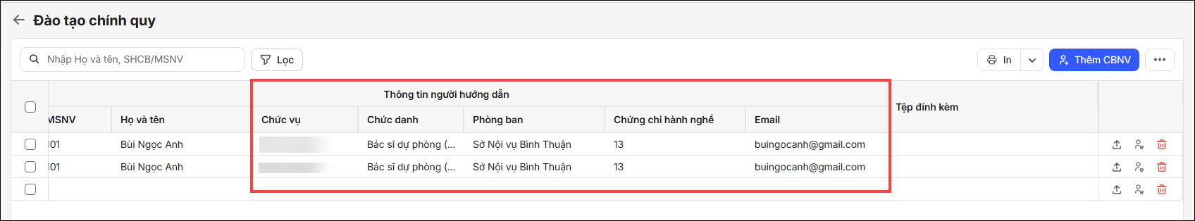 - Vào Đào tạo, bồi dưỡng nhấn đúp chuột vào khóa bồi dưỡng muốn thêm người hướng dẫn.