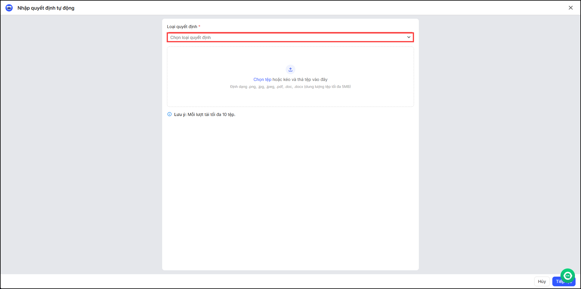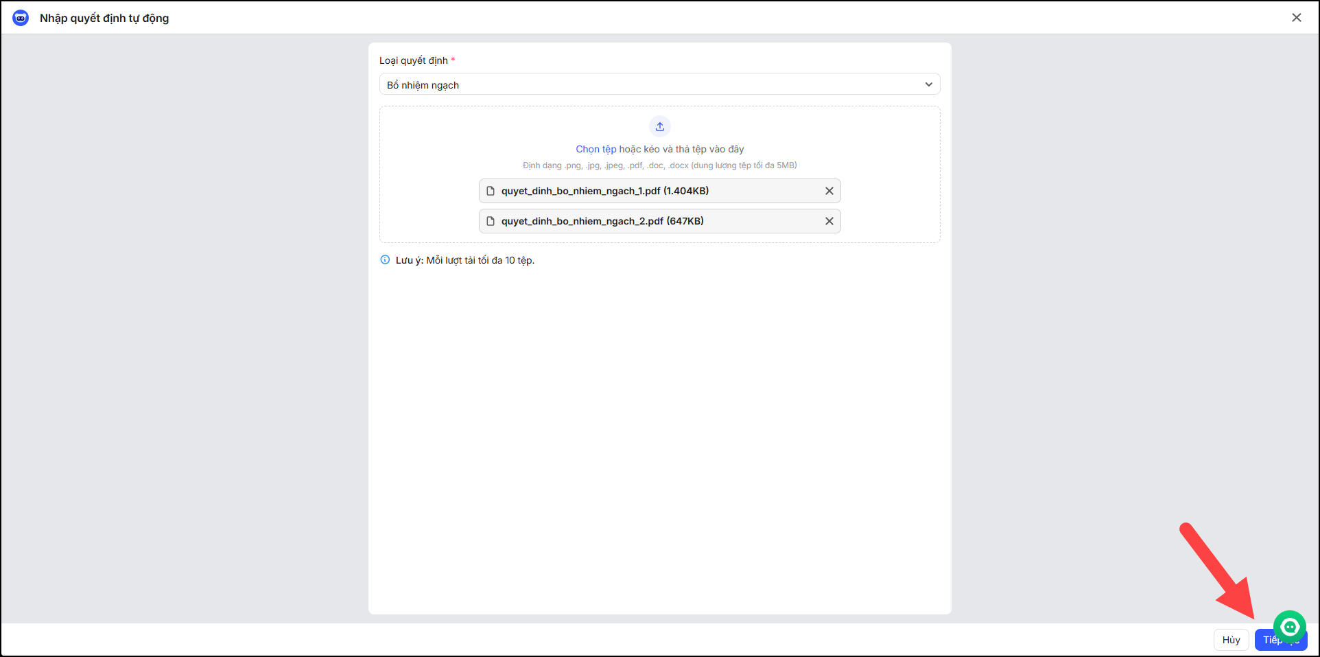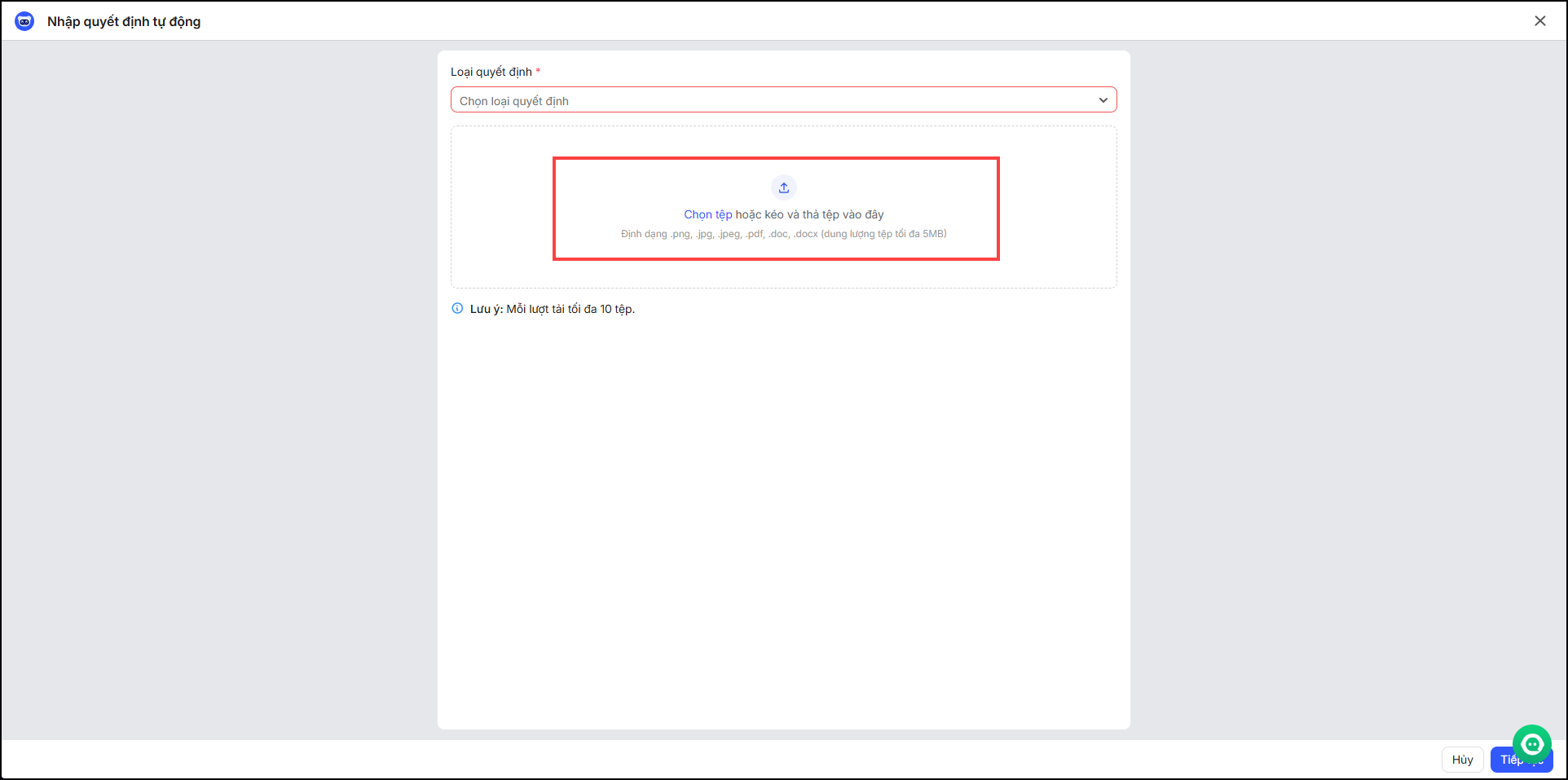 - Lưu ý chỉ tải lên các tệp có định dạng: .png, .jpg, .jpeg, .pdf, .doc, .docx (dung lượng tệp tối đa 5MB), mỗi lần chỉ tải tối đa 10 tệp