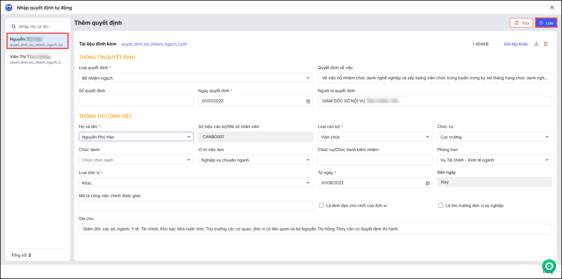 - Trường hợp nhập cùng lúc nhiều quyết định, nhấn chọn từng quyết định sau đó chỉnh sửa lại thông tin