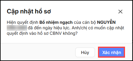5. Hệ thống hiển thị thông báo cập nhật hồ sơ. Anh/chị nhấn Xác nhận.