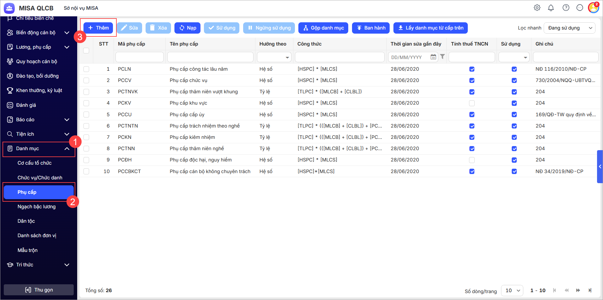 1. Vào Danh mục\Phụ cấp. Nhấn Thêm