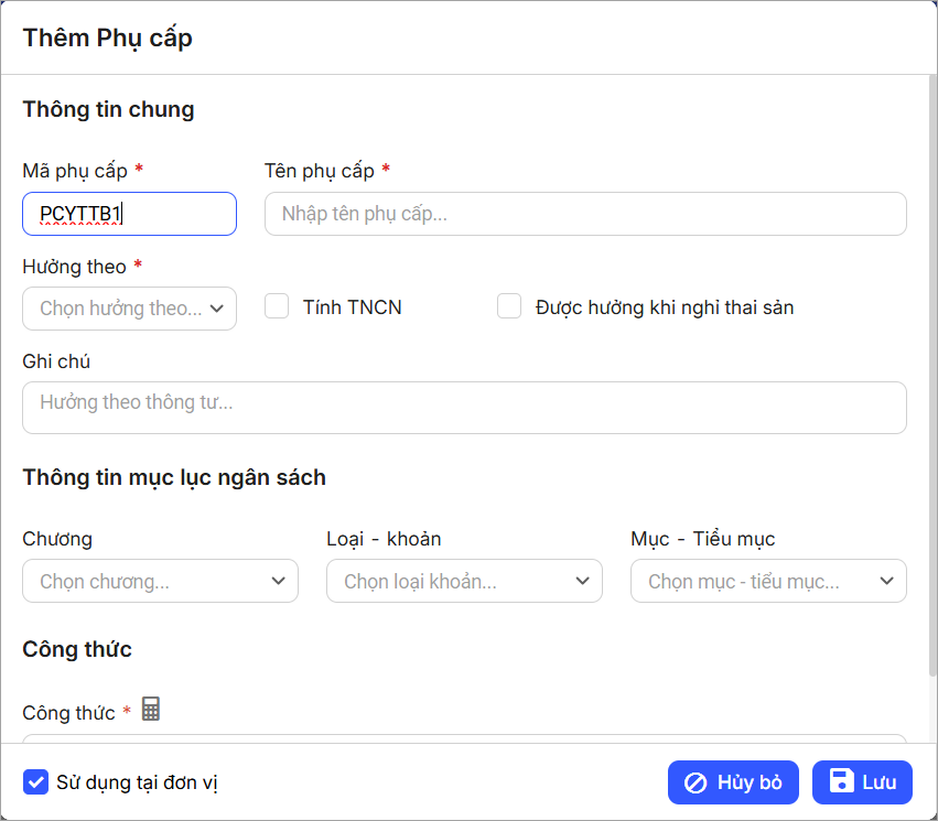 • Tại mục Áp dụng cho: anh/chị có thể tích chọn một hoặc nhiều đơn vị sử dụng phụ cấp này. Lưu ý: Nhấn Tab sau khi chọn Áp dụng cho để chuyển sang phần Công thức.