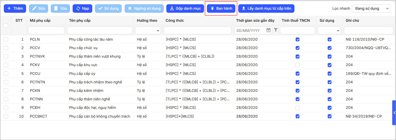 Đơn vị chủ quản (Nội vụ) ban hành danh mục phụ cấp cho các đơn vị cấp dưới. Lưu ý: Đơn vị chủ quản Tài chính (Sở tài chính) không ban hành được danh mục phụ cấp.