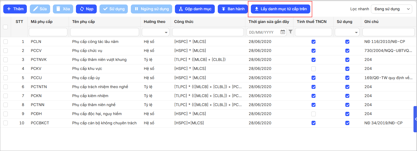 2. Ngoài ra, đơn vị trực thuộc có thể vào Danh mục/Phụ cấp, nhấn Lấy danh mục từ cấp trên để thực hiện đồng bộ danh mục.3. Đối với những loại phụ cấp mà đơn vị đang có, nhấn vào dấu + để đồng bộ loại phụ cấp đó với danh mục của cấp trên cập nhật/bổ sung. Chọn vào tên của phụ cấp đang quản lý. Thông tin về phụ cấp đang quản lý sẽ được thay thế bởi thông tin phụ cấp của đơn vị chủ quản