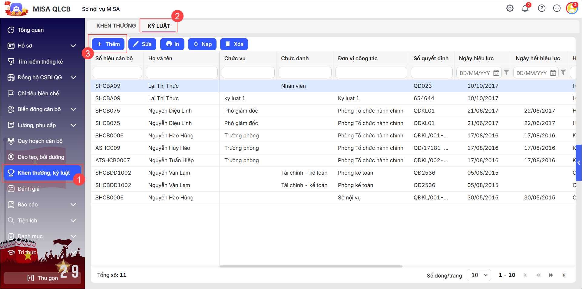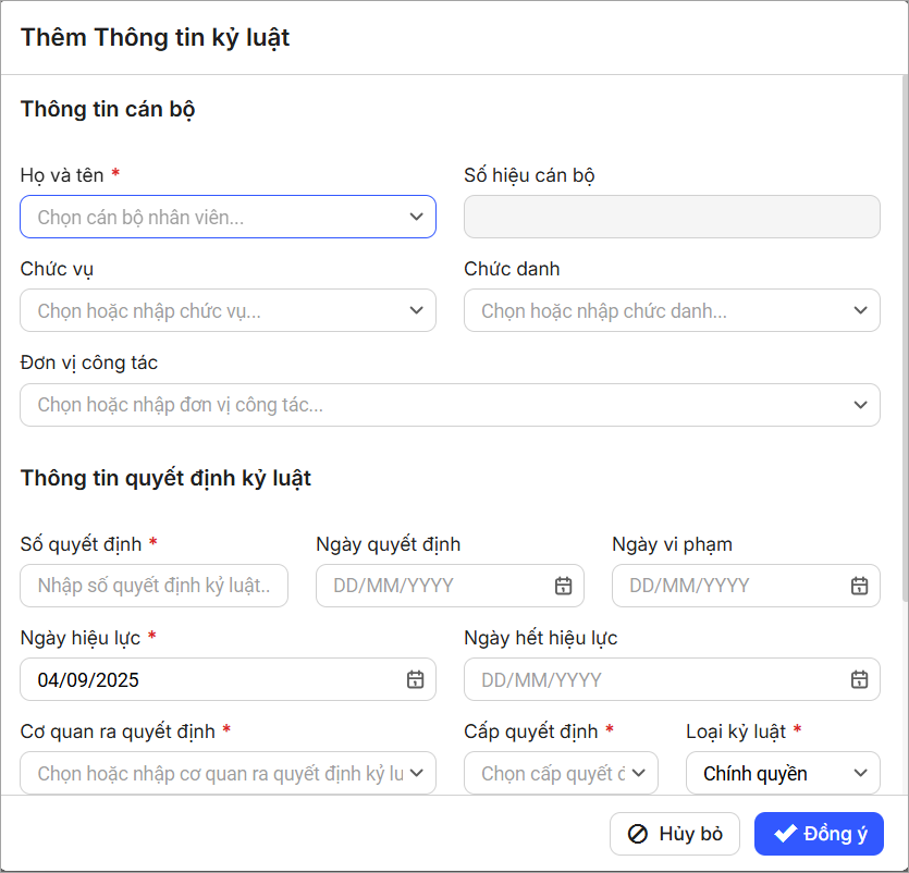 • Nhập Số quyết định, Ngày hiệu lực, chọn Hình thức kỷ luật (các thông tin bắt buộc khai báo).