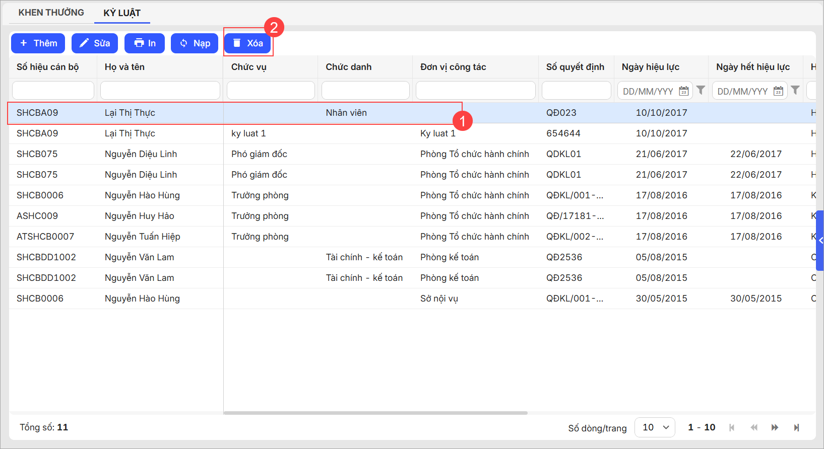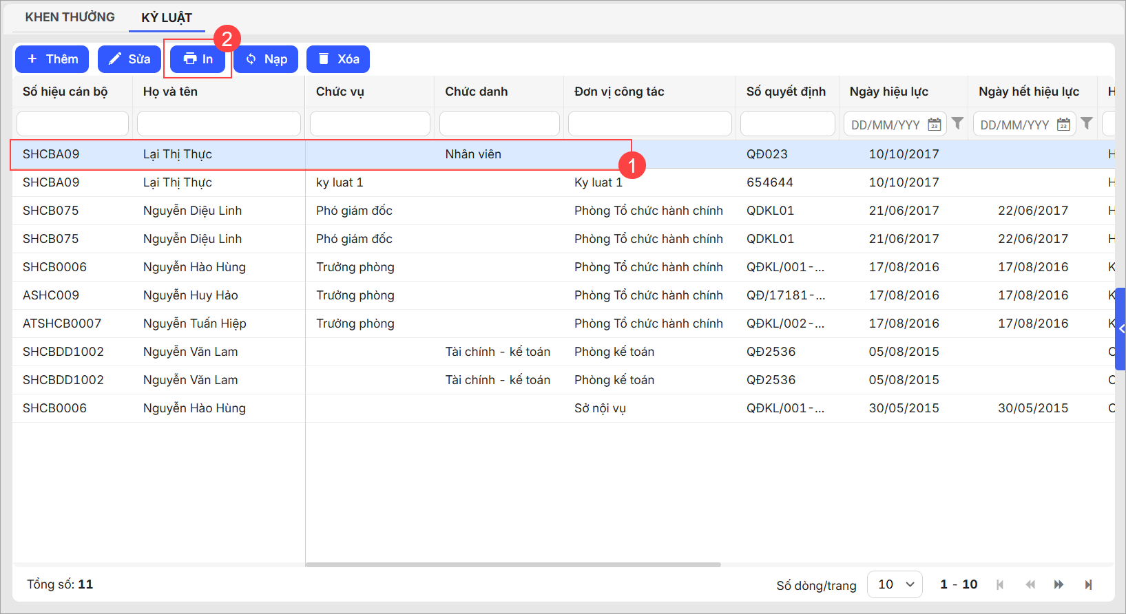 5. Nhấn In để in danh sách cán bộ nhân viên bị kỷ luật.6. Trường hợp muốn xóa cán bộ nhân viên nào không thuộc danh sách bị kỷ luật thì CBTC chọn cán bộ nhân viên, nhấn Xóa.