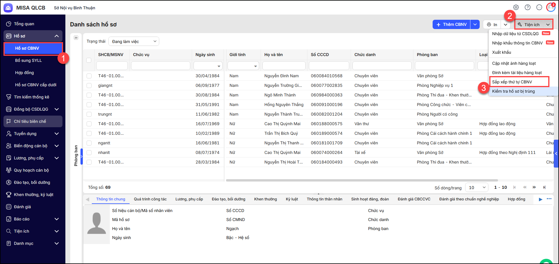 - Vào Hồ sơ/Hồ sơ CBNV. Nhấn Tiện ích, chọn Sắp xếp thứ tự CNBV