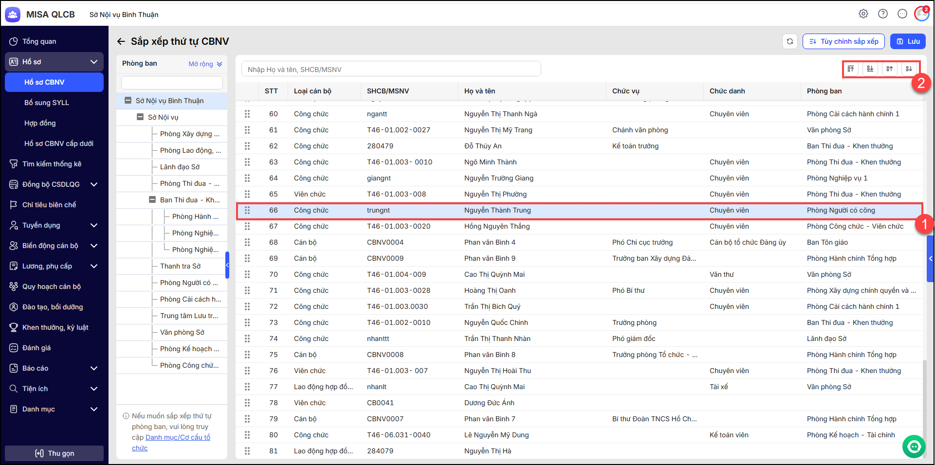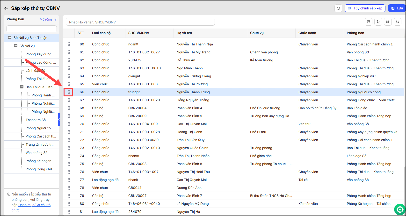 2.1. Nhấn nút (khoanh đỏ) tại tên cán bộ nhân viên sau đó nhấn giữ chuột và thực hiện di chuyển vị trí lên/xuống.