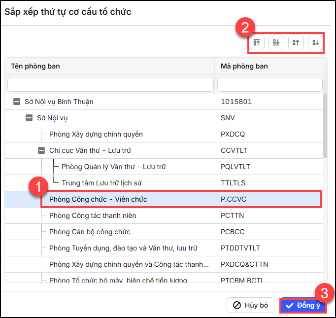 2. Chọn tên phòng ban sau đó nhấn biểu tượng lên/xuống để sắp xếp lại vị trí hiển thị phòng ban theo nhu cầu.