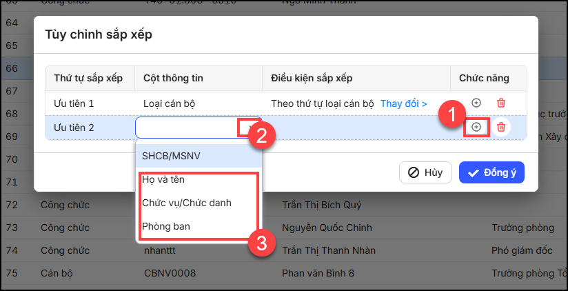 - Nhấn dấu (+) để thêm mới cấp độ ưu tiên. Tại cột thông tin chọn sắp xếp theo: Họ tên/chức vụ/chức danh hoặc theo phòng ban.