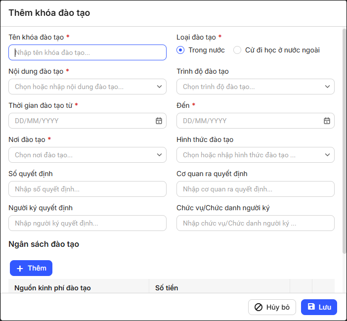 - Ngân sách đào tạo: Nhấn + Thêm để nhập nguồn kinh phí đào tạo và số tiền tương ứng nếu có.