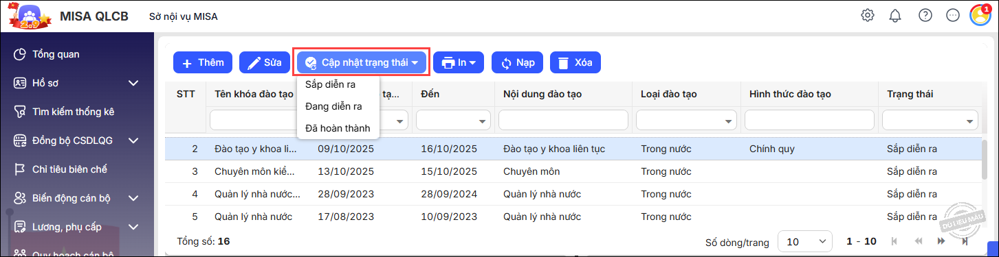 1. Sau khi thêm mới khóa đào tạo, hệ thống mặc định trạng thái là Sắp diễn ra, anh/chị có thể nhấn Cập nhật trạng thái trên thanh công cụ để cập nhật trạng thái của khóa đào tạo.