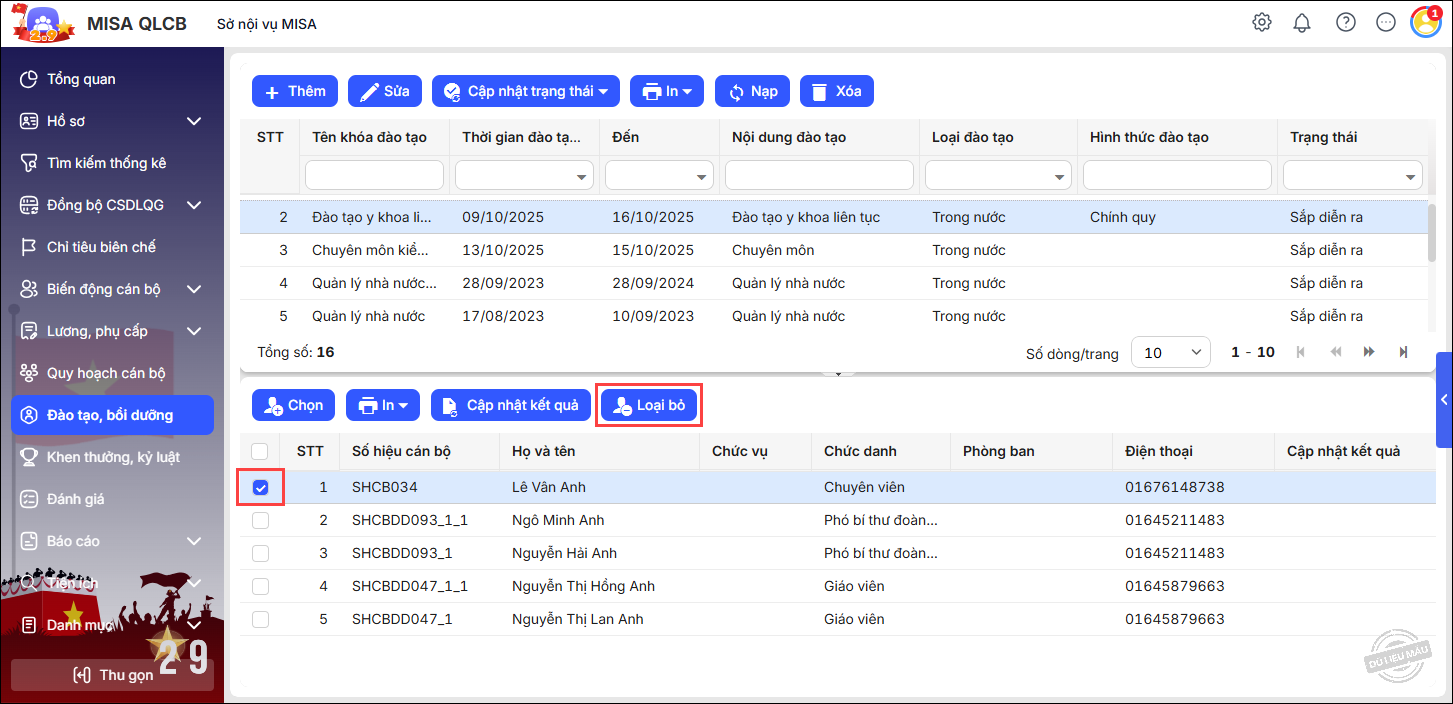 4. Nếu muốn loại bỏ cán bộ nhân viên nào trong danh sách cử đi học, anh/chị chọn cán bộ nhân viên trên danh sách, nhấn Loại bỏ.