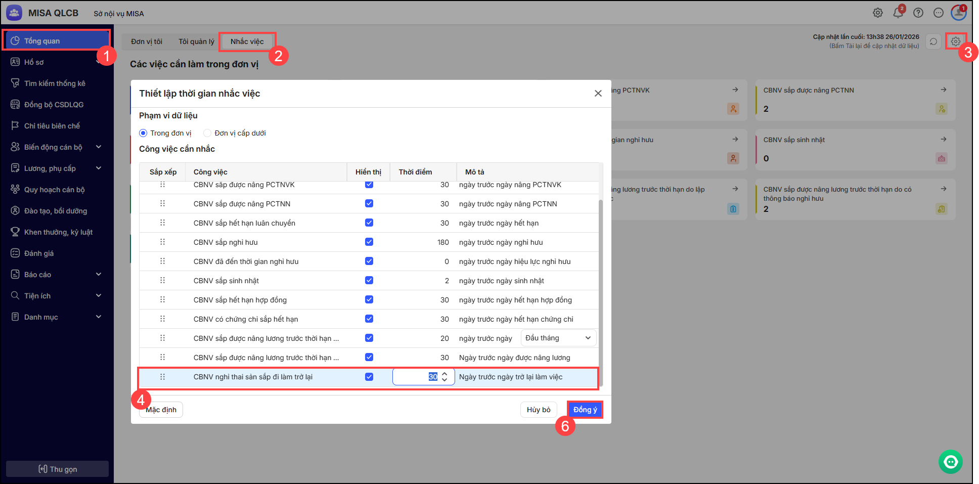 3. Phần mềm cho phép thiết lập thời gian nhắc nhở trước ngày CBNV đi làm trở lại.