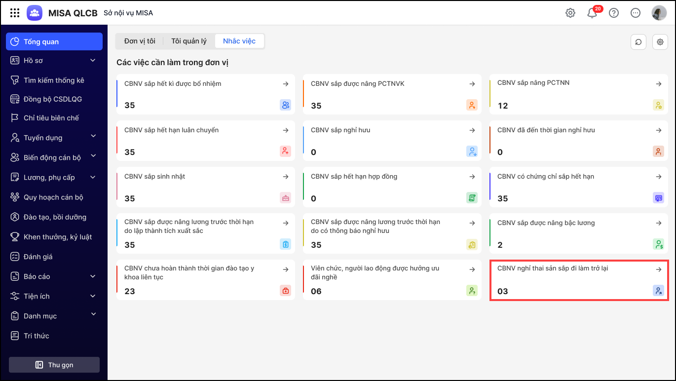 - Vào menu Tổng quan/Nhắc việc. Chọn CBNV nghỉ thai sản sắp đi làm trở lại