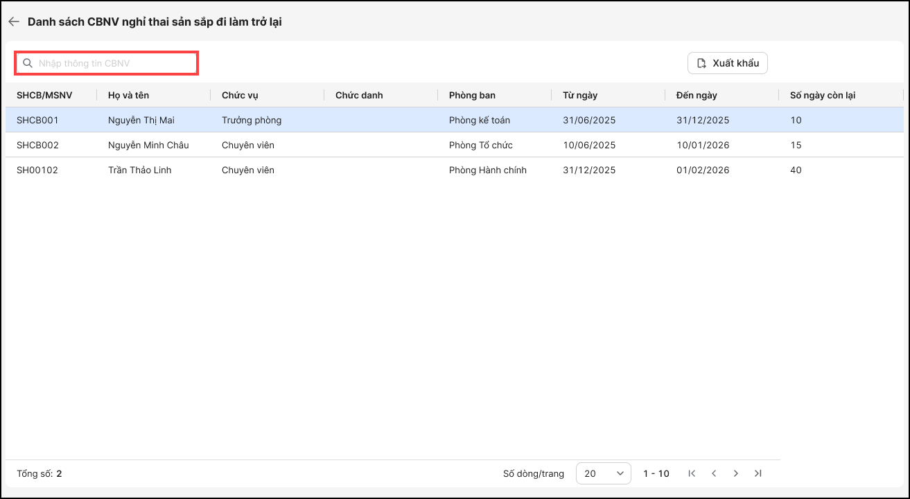 2. Phần mềm hiển thị danh sách CNNV nghỉ thai sản sắp đi làm trở lại. CBTC có thể theo dõi các thông tin như: