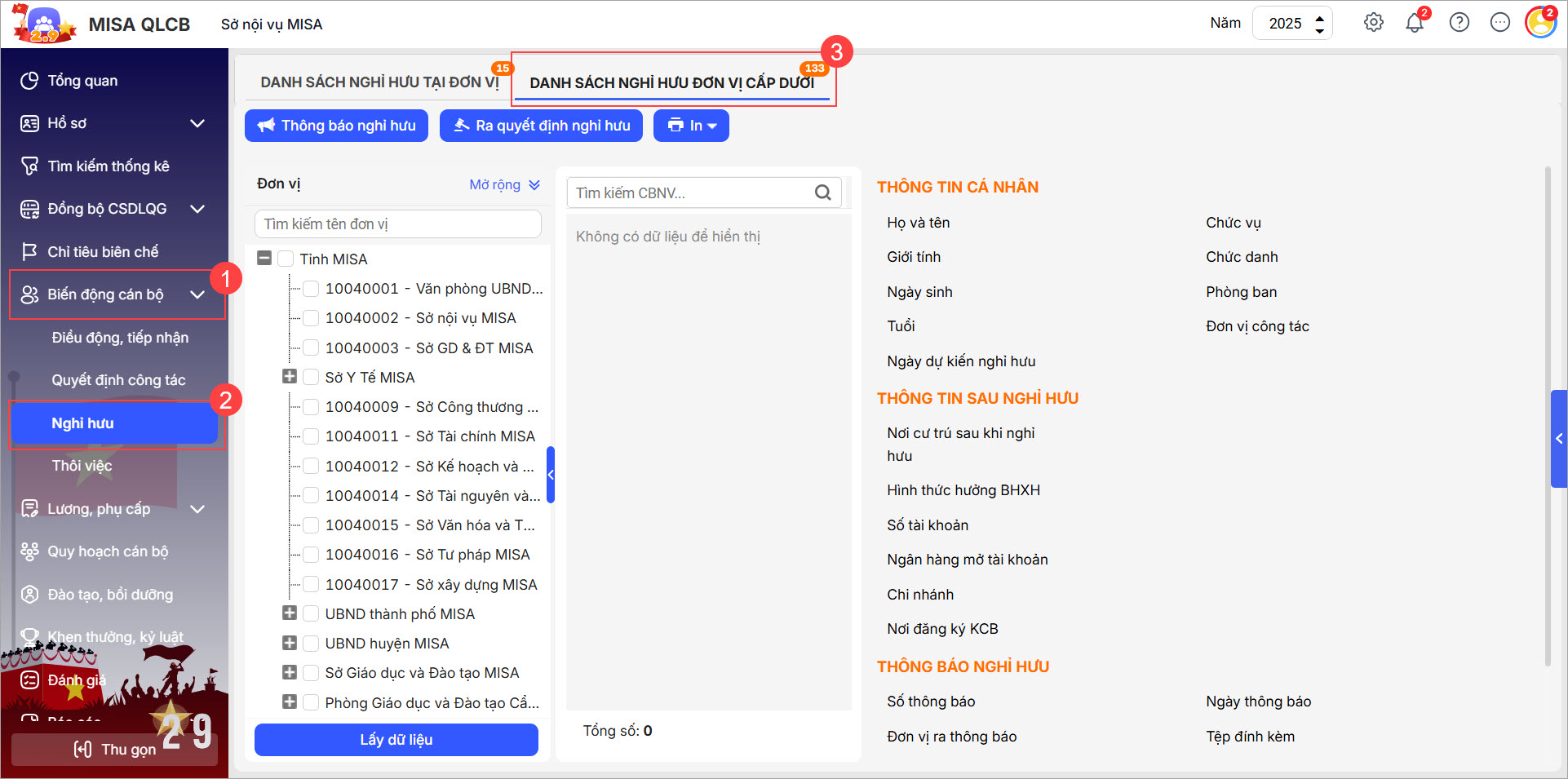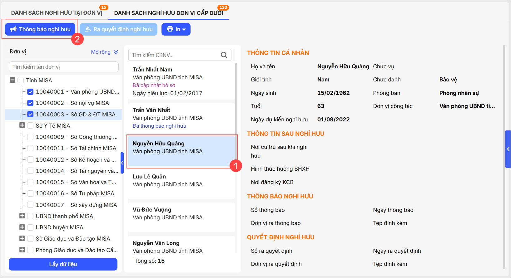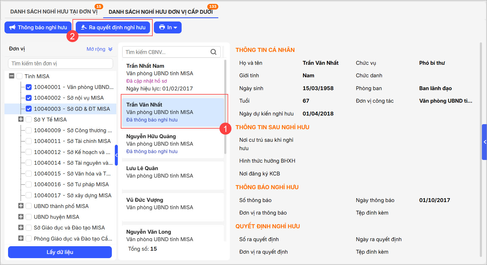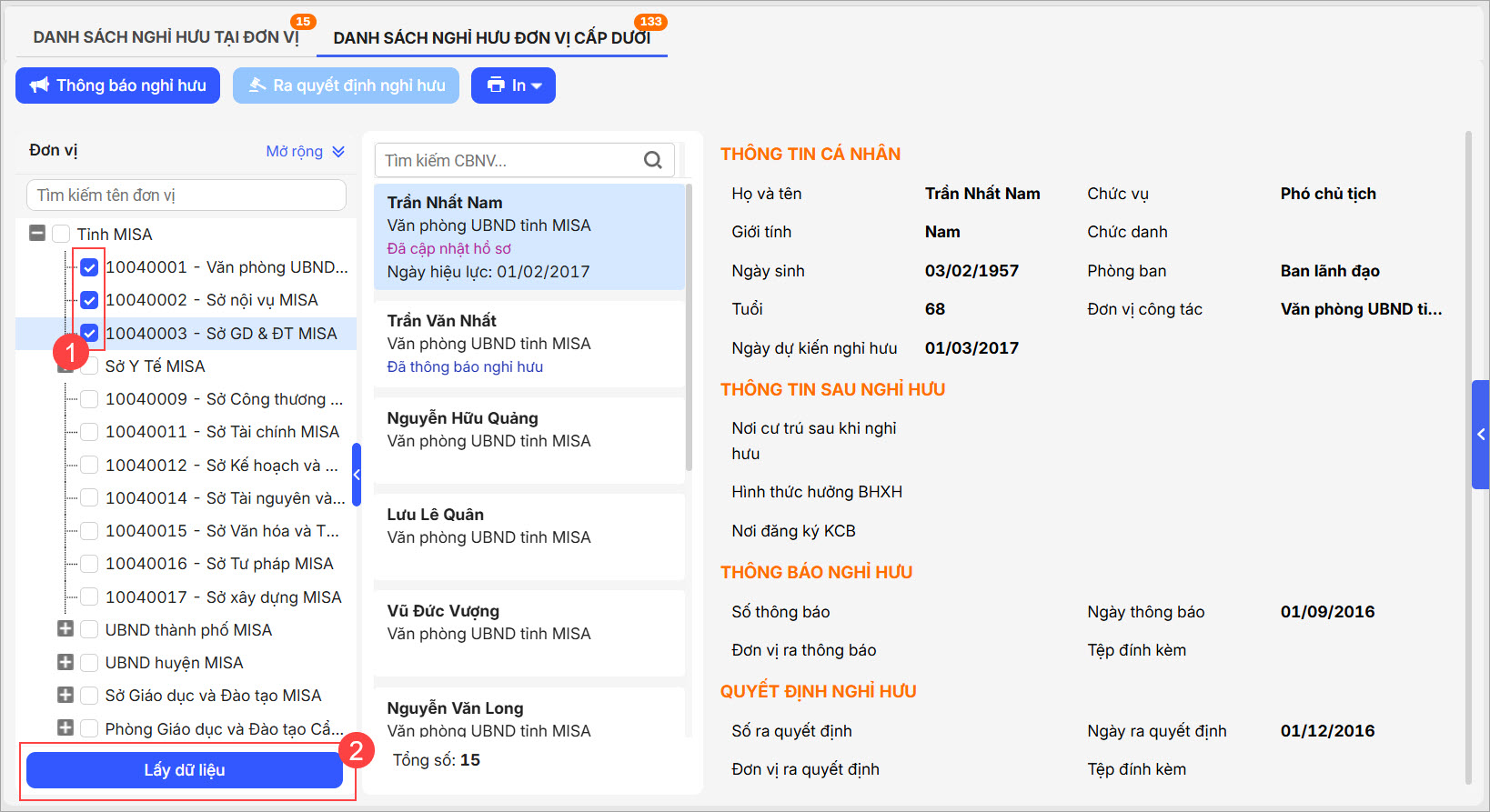 • Tích chọn đơn vị, chọn Lấy dữ liệu phần mềm sẽ hiển thị danh sách nghỉ hưu đơn vị cấp dưới.