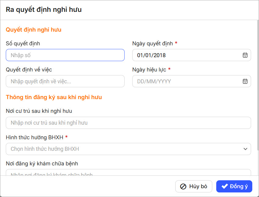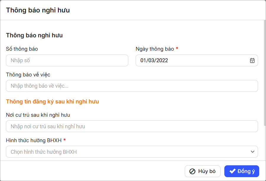 • Ngày thông báo (*): Chọn ngày ký thông báo nghỉ hưu (bắt buộc nhập).