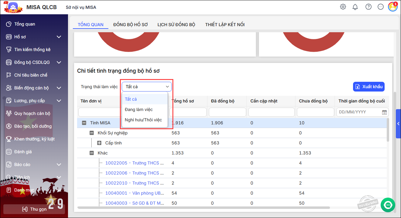 Phần mềm đáp ứng cho cán bộ tổ chức thống kê chính xác số lượng hồ sơ đã đồng bộ lên Cơ sở dữ liệu Quốc gia theo từng trạng thái làm việc: đang làm việc, nghỉ hưu/thôi việc.