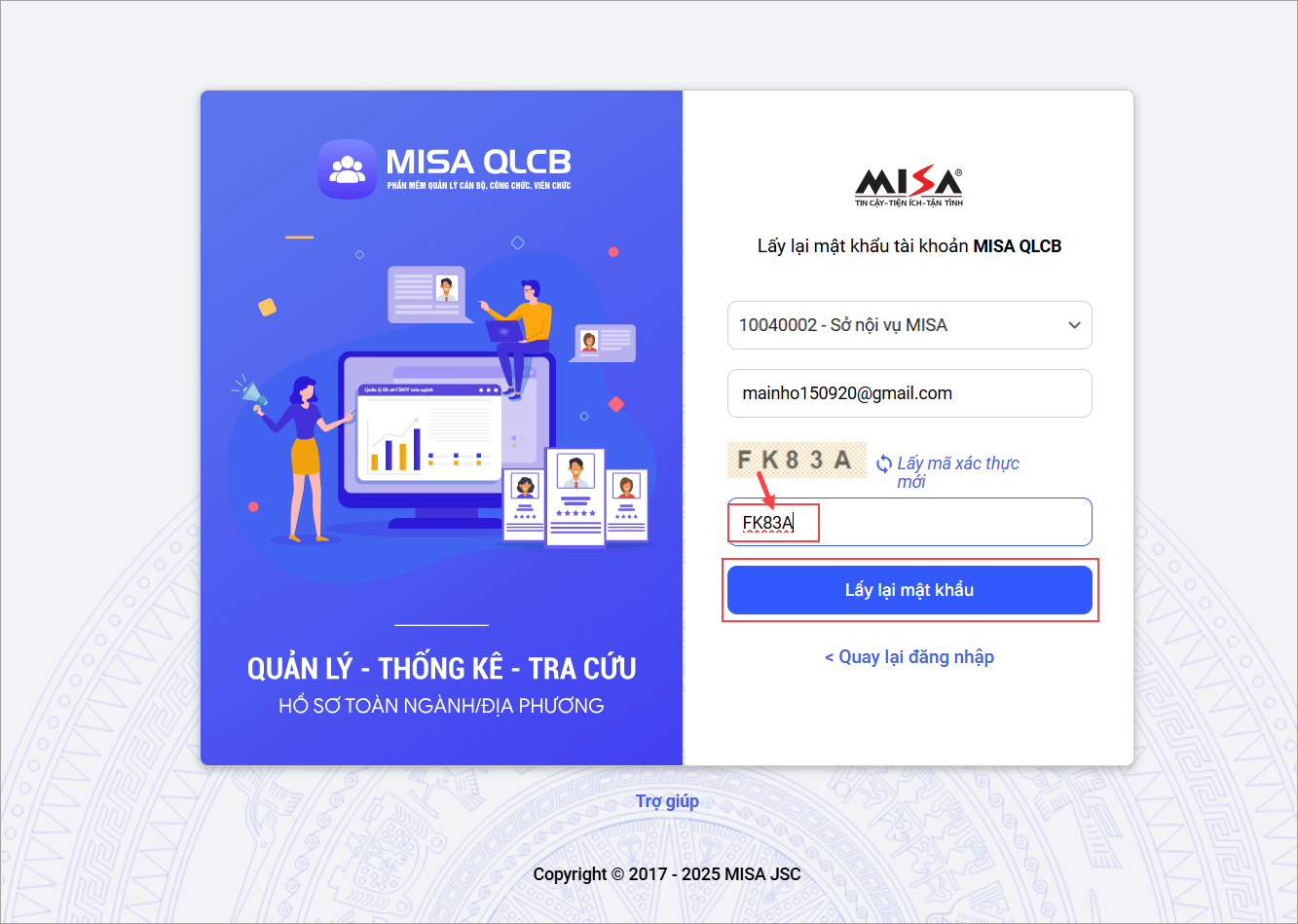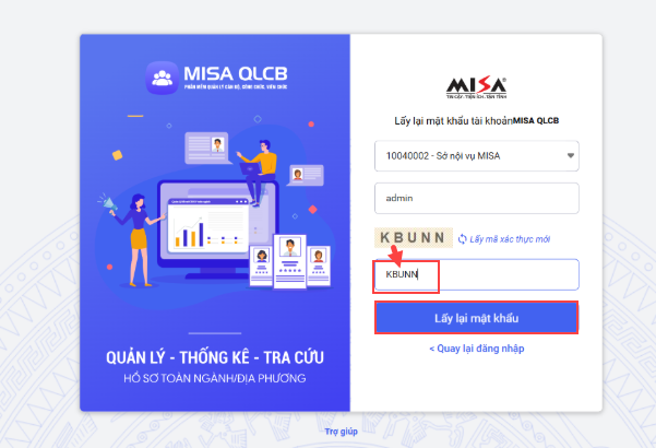 - Nhập mã xác thực theo yêu cầu và ấn Lấy lại mật khẩu.