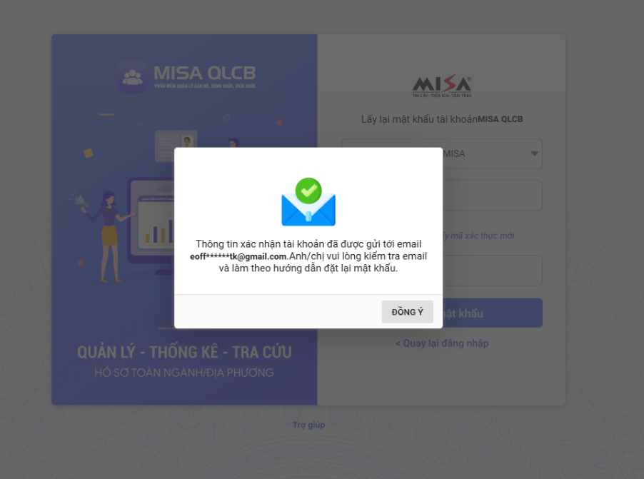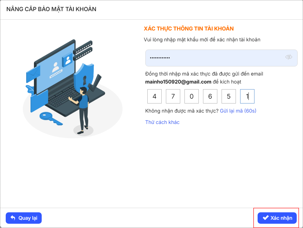 - Sau khi cập nhật email thành công, anh/chị thực hiện lại các bước xử lý giống như trong Trường hợp 1 để khôi phục và nâng cấp bảo mật tài khoản.