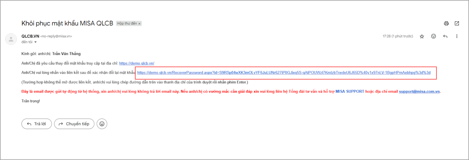 - Mở email nhận được, nhấp vào đường dẫn trong email để đổi mật khẩu.