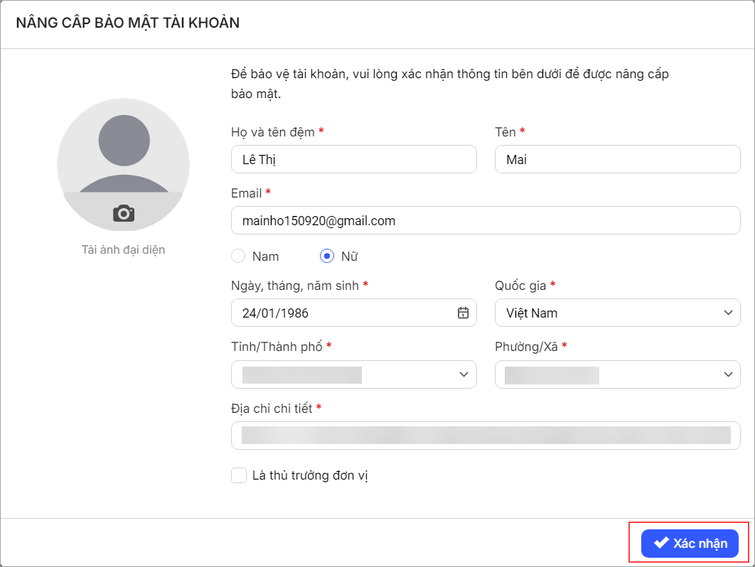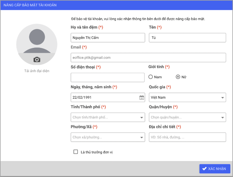 - Phần mềm sẽ hiển thị thông báo, anh/chị hoàn thiện thông tin: Họ và tên, email (Lưu ý: nhập đúng email đang sử dụng để nhận mã xác thực), địa chỉ,…