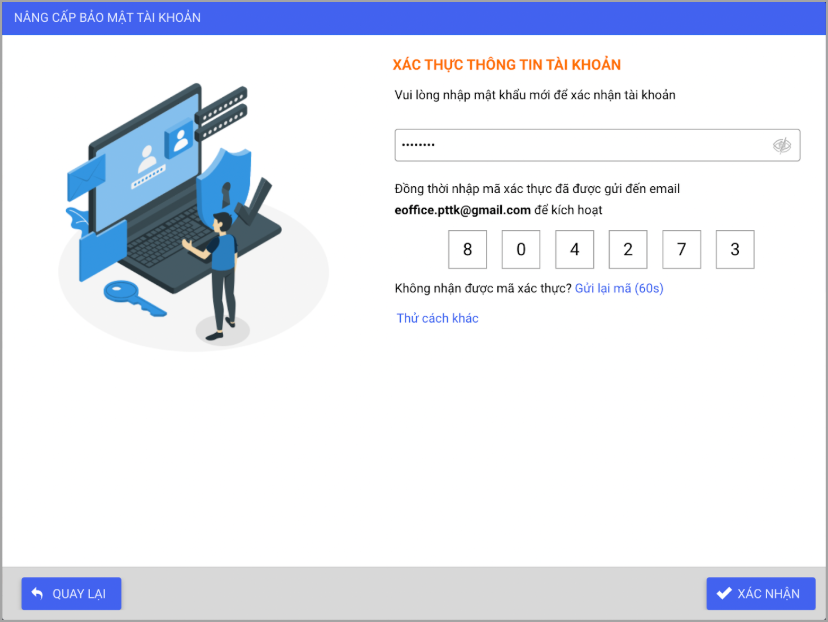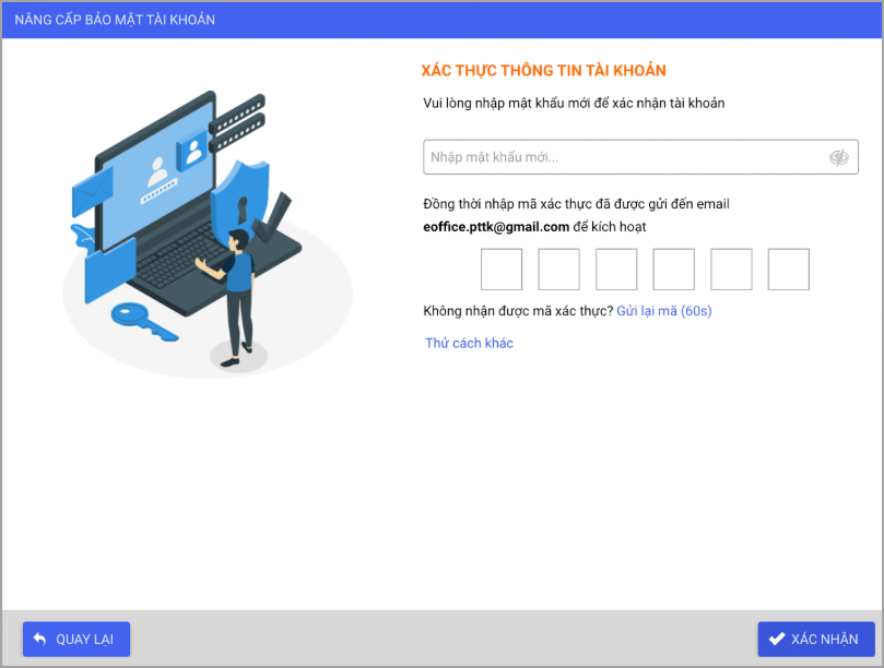 - Nhập mật khẩu mới để xác nhận tài khoản, đồng thời kiểm tra email để lấy mã xác thực được gửi đến email
