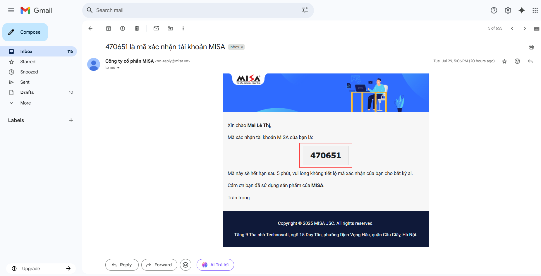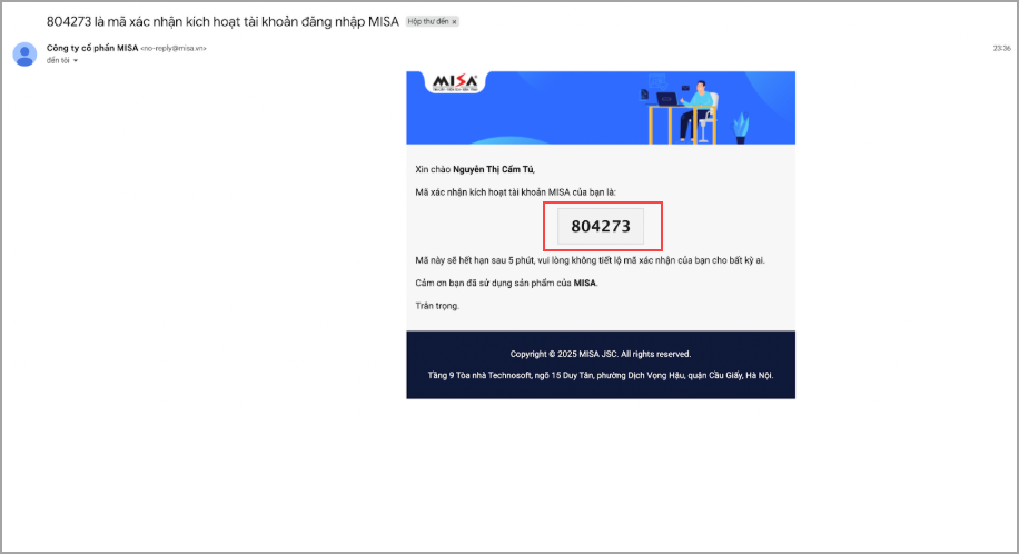 - Hệ thống sẽ gửi email xác nhận đến địa chỉ email định danh đã khai báo.