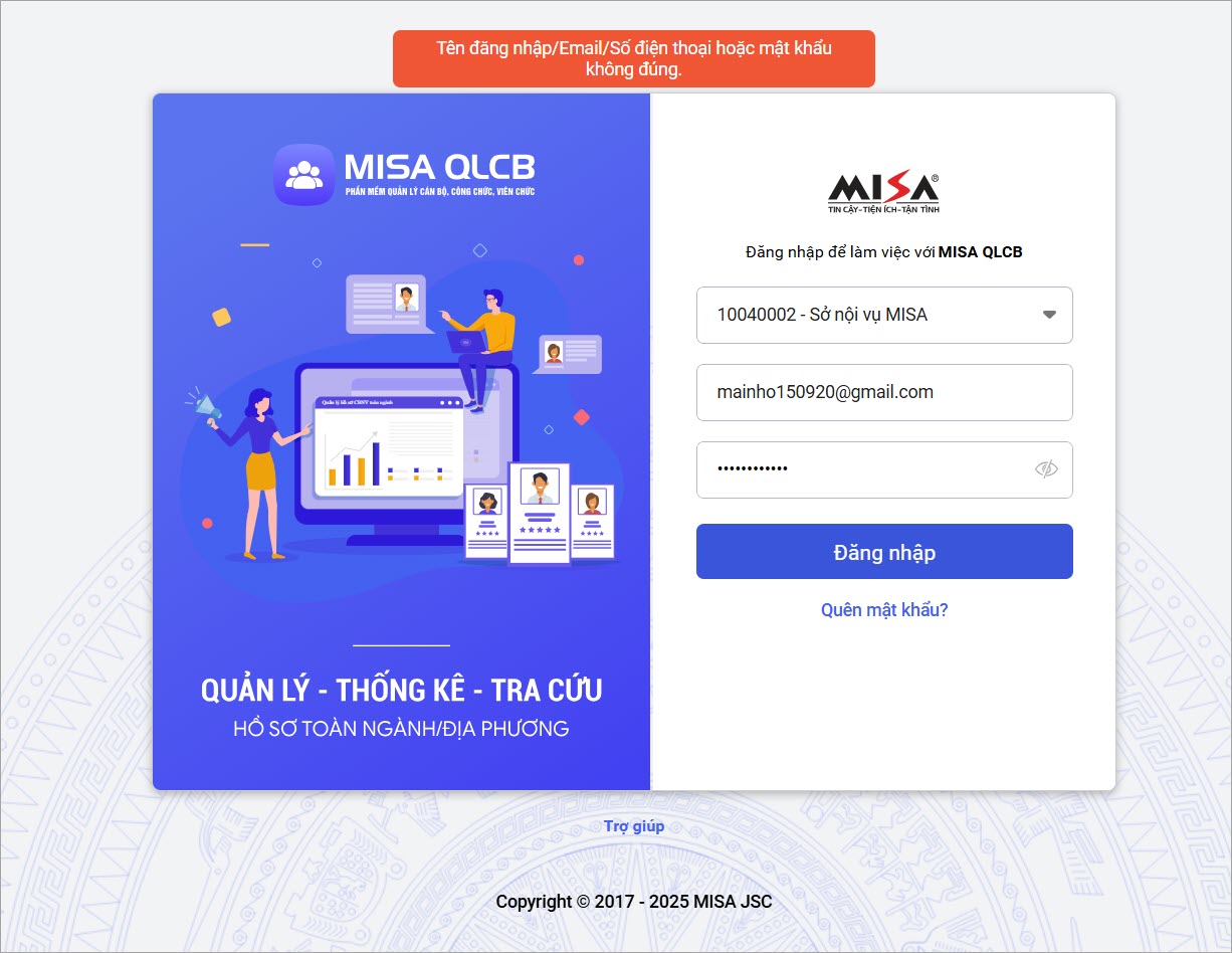- Nếu CBNV chưa có email định danh trong hồ sơ, anh/chị cần liên hệ với quản trị hệ thống hoặc cán bộ tổ chức đơn vị để cập nhật, nhập email định danh cá nhân cho CBNV.