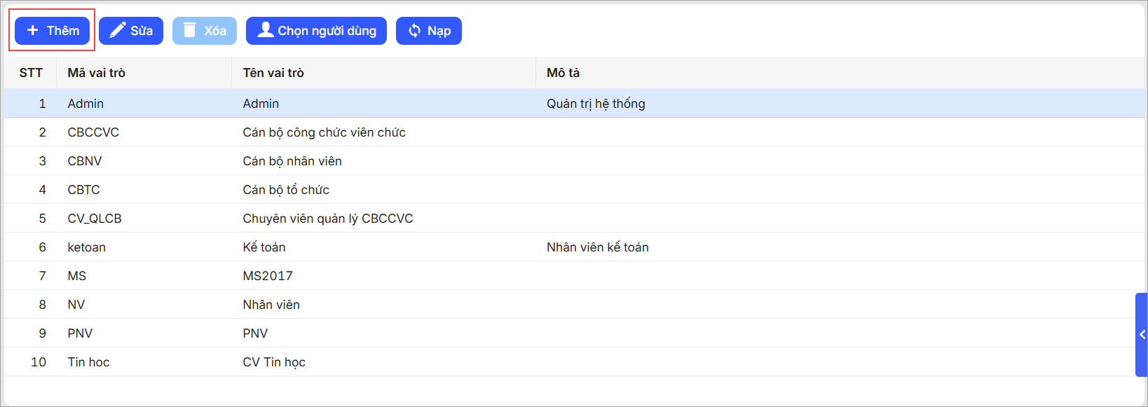 - Để thêm các vai trò theo nhu cầu quản lý đơn vị, chọn Thêm.
