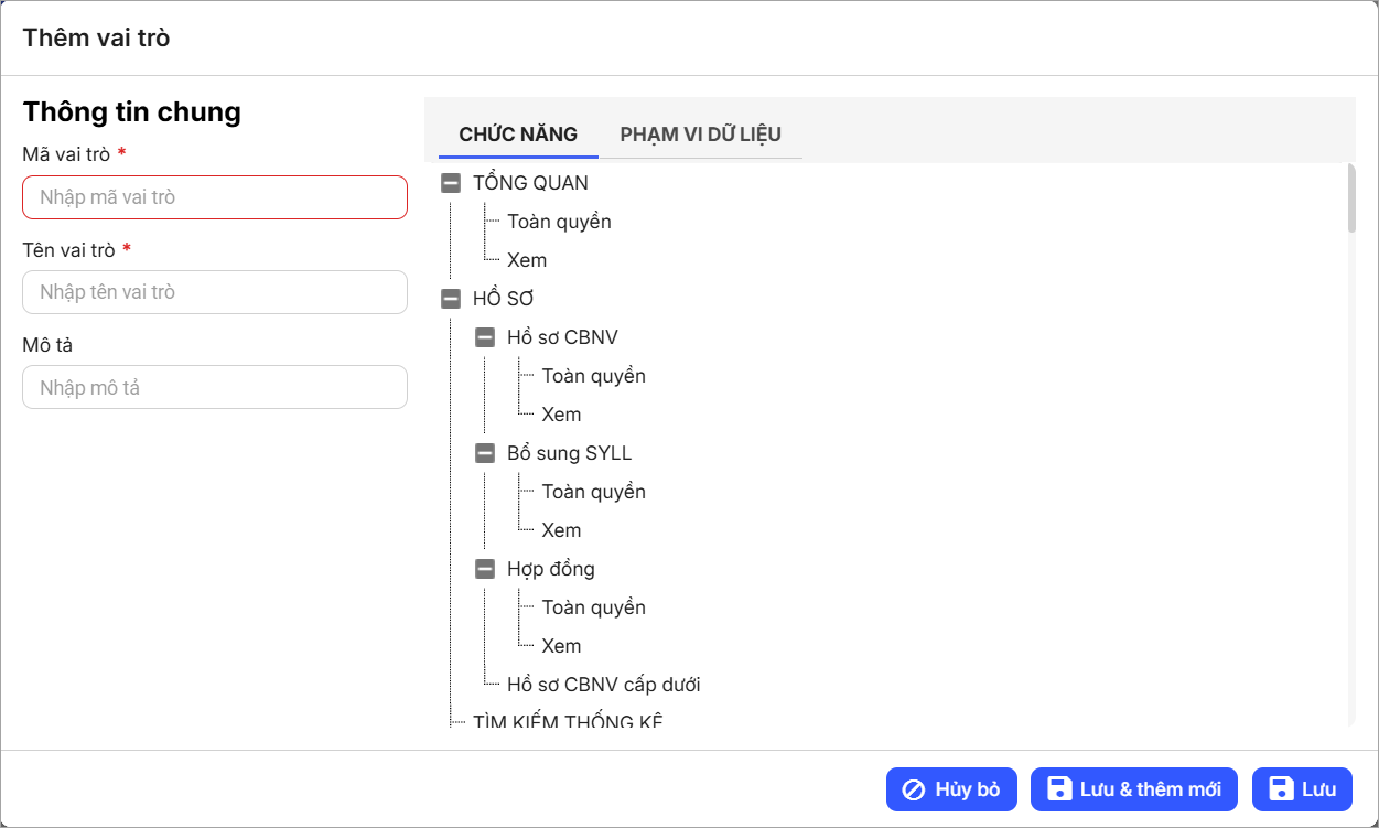 Mục đích: Giúp Quản trị hệ thống/CBTC thêm mới vai trò; phân quyền truy cập dữ liệu để tra cứu hồ sơ cán bộ và thống kê biểu đồ, báo cáo; phân quyền; chọn người dùng cho CBNV tại đơn vị