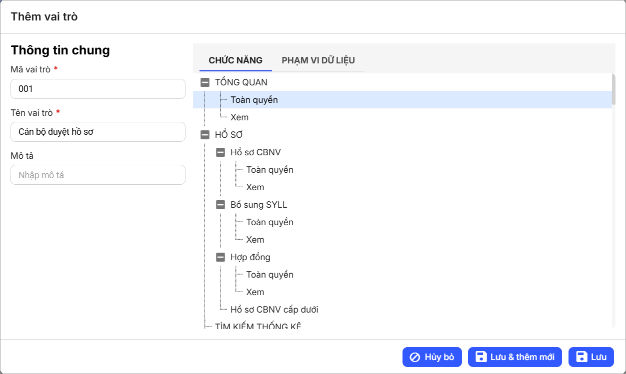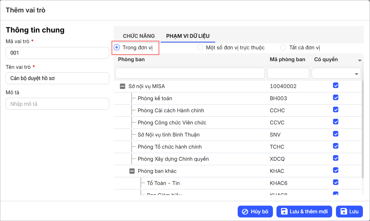 - Trong đơn vị: Vai trò chỉ có quyền trên hồ sơ của đơn vị mình.