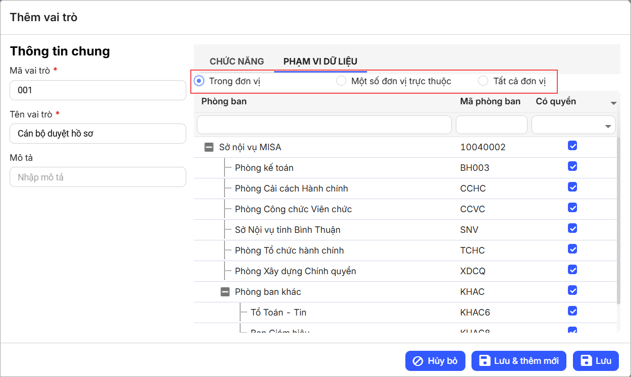 - Đối với Đơn vị trực thuộc: Chỉ có phạm vi Trong đơn vị.