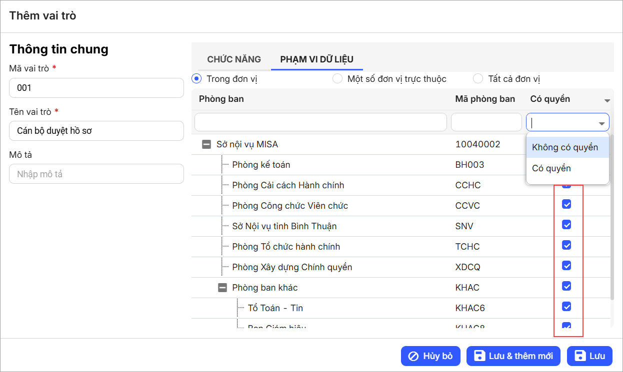 - Tích chọn những đơn vị vai trò có quyền truy cập dữ liệu.