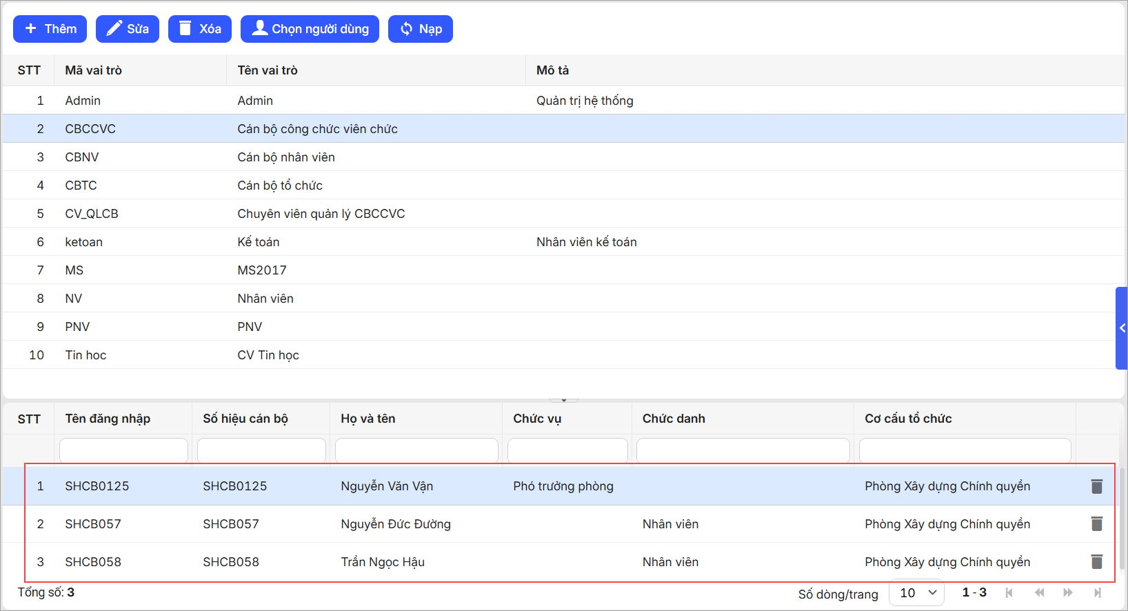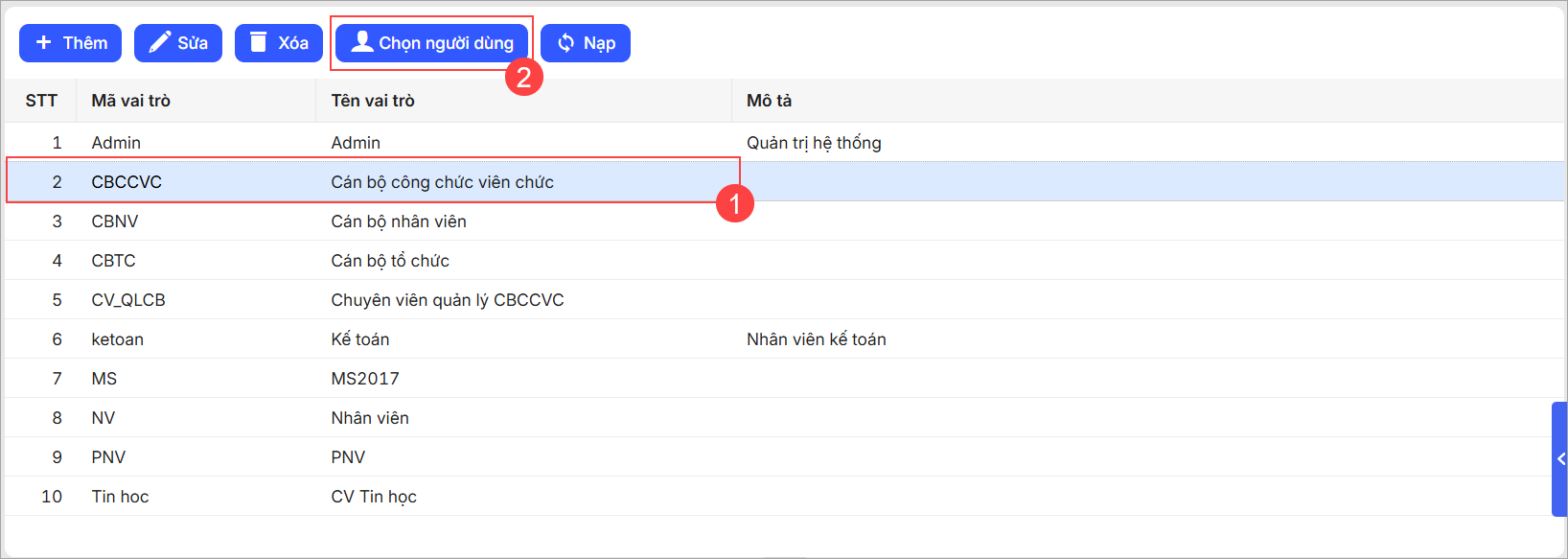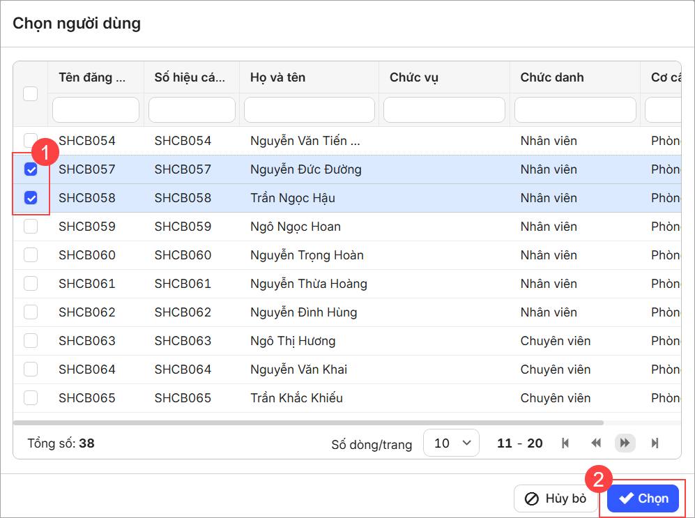 - Tích chọn các CBCCVC được dùng cho vai trò đó. Nhấn Chọn.