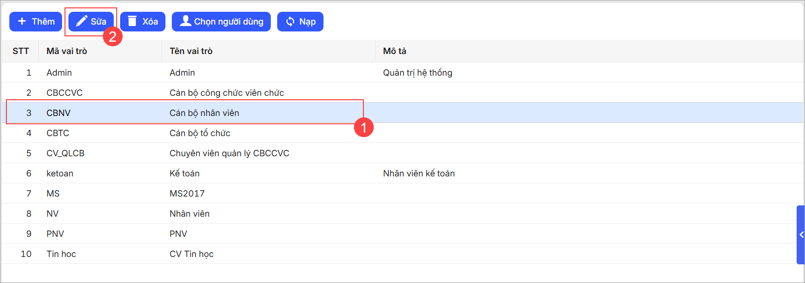 - CBTC chọn vai trò rồi nhấn Sửa và thay đổi thông tin vai trò theo thực tế đơn vị.