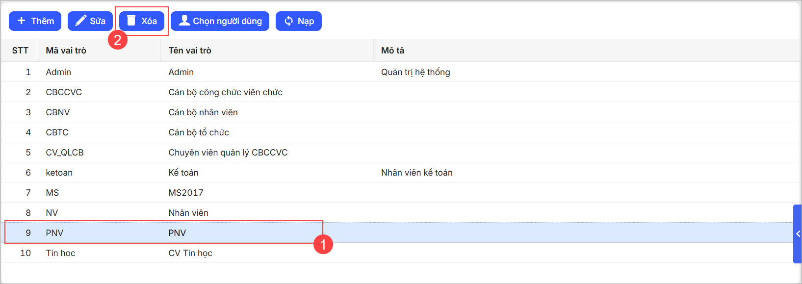Lưu ý: Chỉ xóa được vai trò mà đơn vị tự thêm không xóa được vai trò mặc định của hệ thống. Khi xóa vai trò thì người dùng sẽ không được thực hiện chức năng của vai trò tương ứng