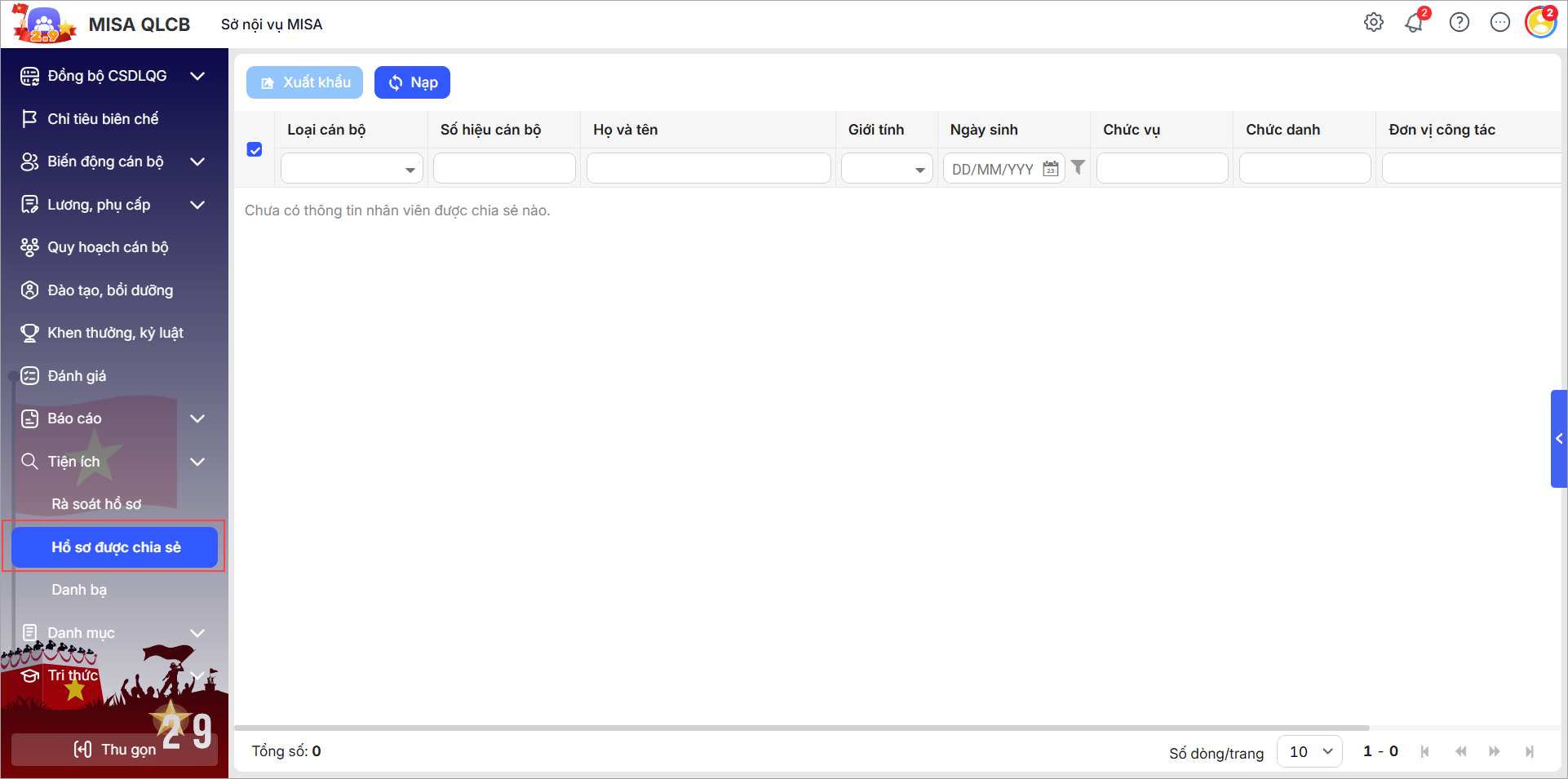 1. Vào menu Tiện ích\Hồ sơ được chia sẻ, phần mềm sẽ hiển thị danh sách hồ sơ CBNV được đơn vị khác chia sẻ