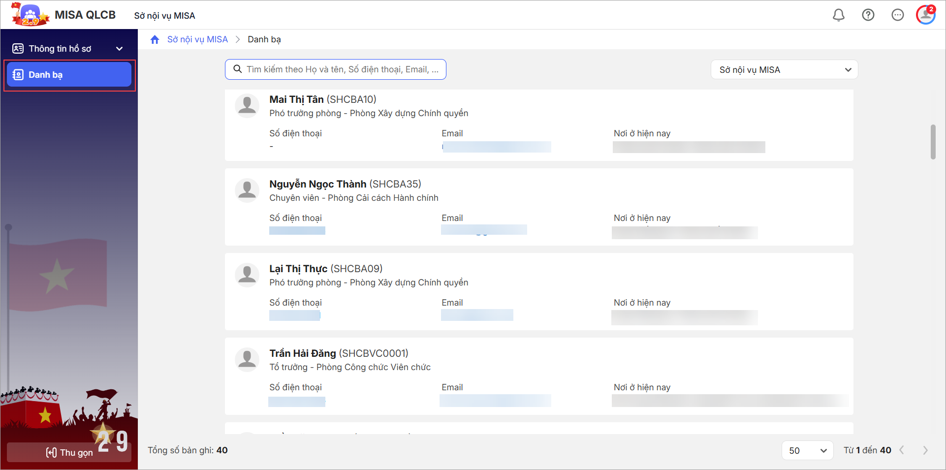 - Tại phần Danh bạ, CBNV có thể nhìn thấy tất cả các thông tin của CBNV khác trong đơn vị để có thể liên lạc khi cần.
