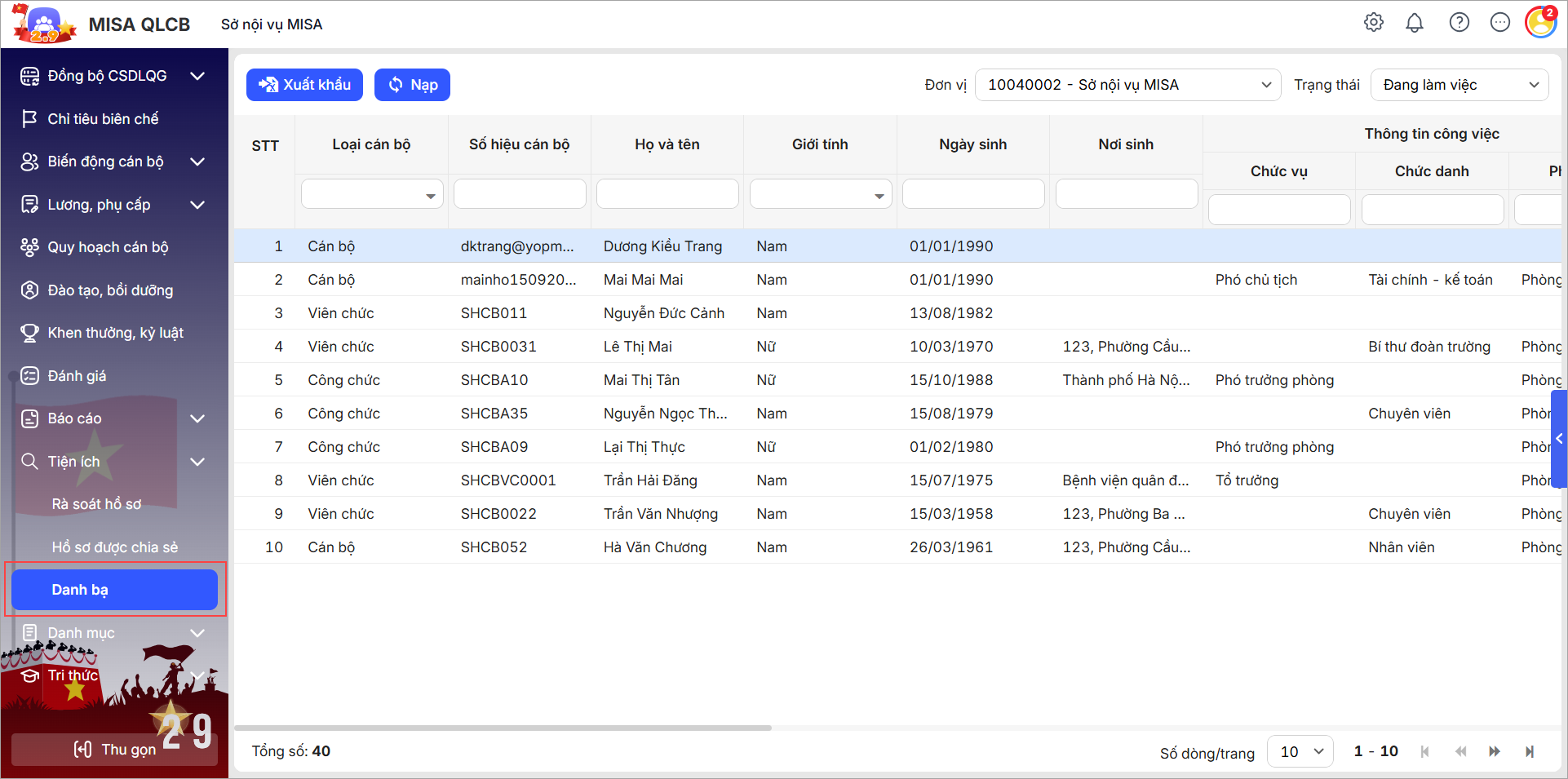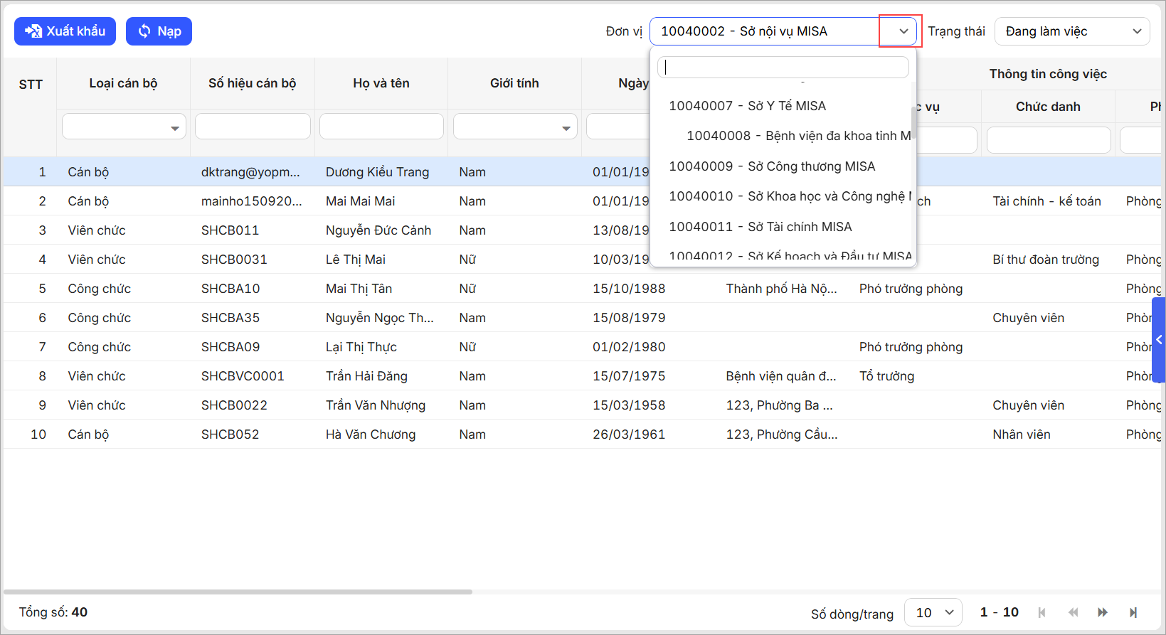 - Anh/chị có thể lọc nhanh các điều kiện tìm kiếm theo Đơn vị, Loại cán bộ, Số hiệu cán bộ, Họ và tên, Giới tính…